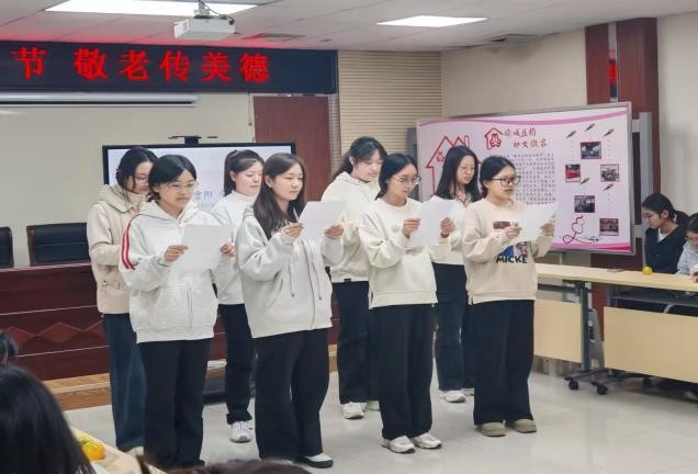 此次活动前,团支部成员分工明确,对接社区确定流程,编排节目;随着敬老活动正式拉开帷幕,成员们依次呈现精彩节目:歌唱经典歌曲传递温暖,舞蹈表演展现青春活力,三句半以幽默语言讲述敬老故事,诗歌朗诵抒发对长辈的敬意,最后全体成员与老人们一起进行大合唱并表演手势舞,协助老人拍摄电子照片,将专业技术转换为暖心关怀,传递节日祝福。现场氛围热烈。